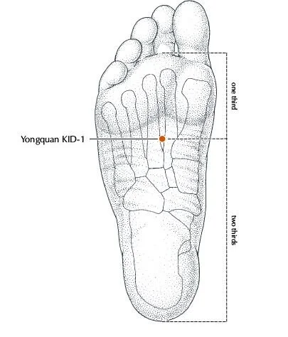 The Kidney Channel starts at the base of the foot, in a point called Yongquan—Gushing Spring. This is a great point for strengthening the Kidneys (Adrenals too) plus as the lowest point on the body, it has a powerful descending and grounding effect.